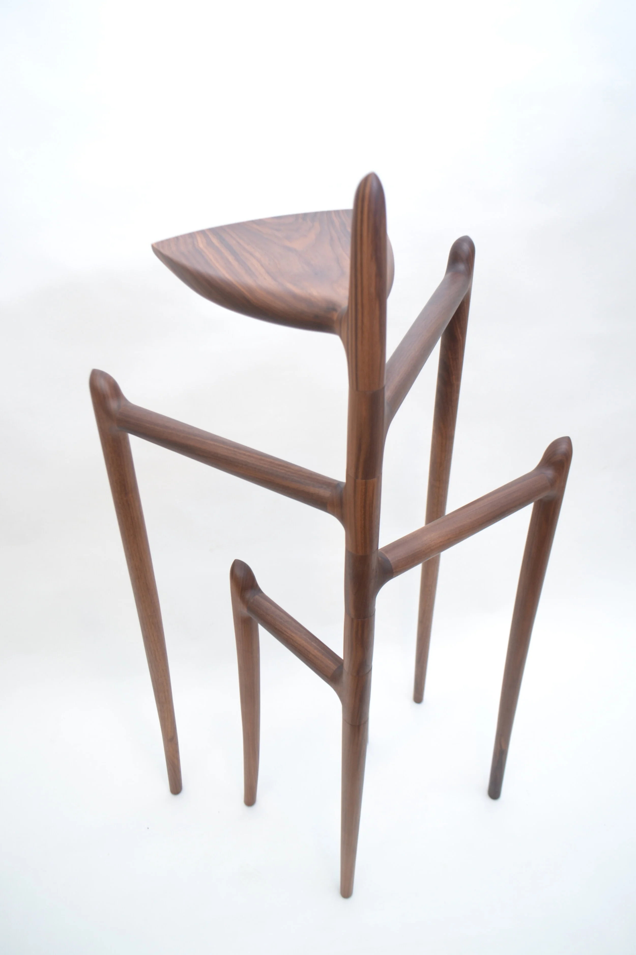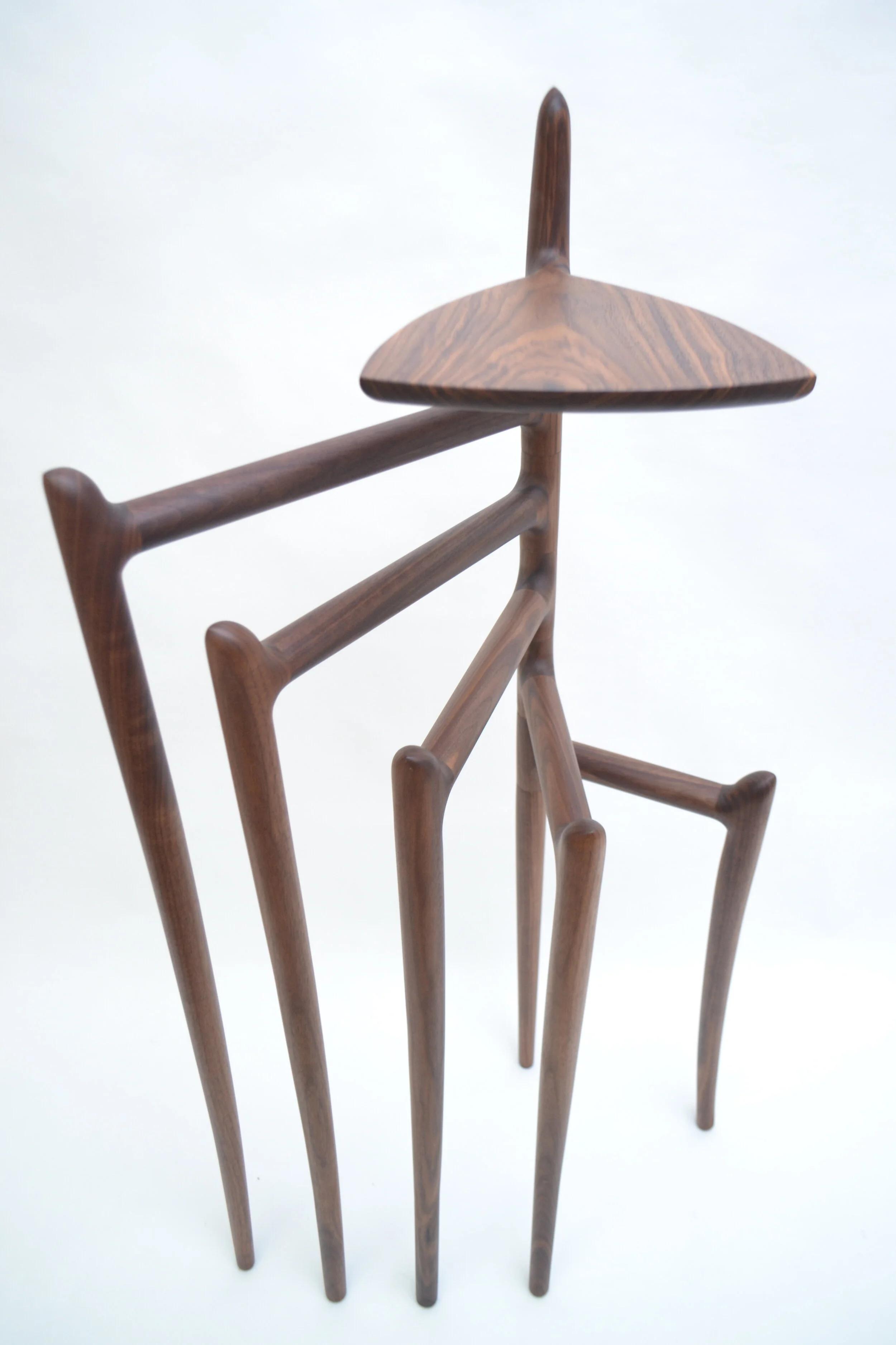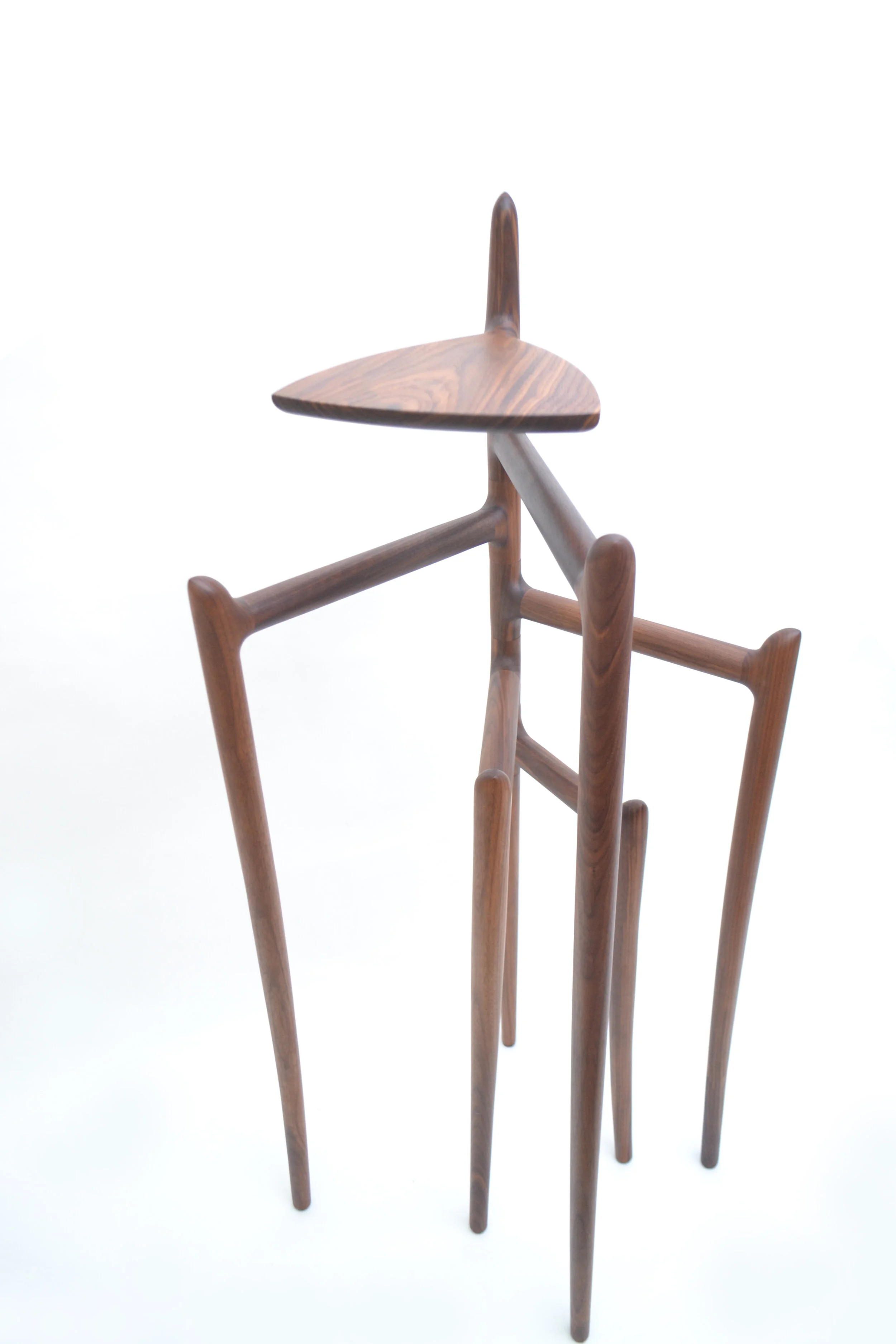 Inspired by the KO table, Seiji designed and crafted this one-of-a-kind custom piece. Each leg rotates freely, offering both flexibility and style, while a triangular-shaped shelf provides space for small items. The top of each leg features a hook for hanging jackets, scarves, hats, and more. Entirely hand-carved, this piece combines functionality with meticulous craftsmanship, resulting in a stunning work of art.
