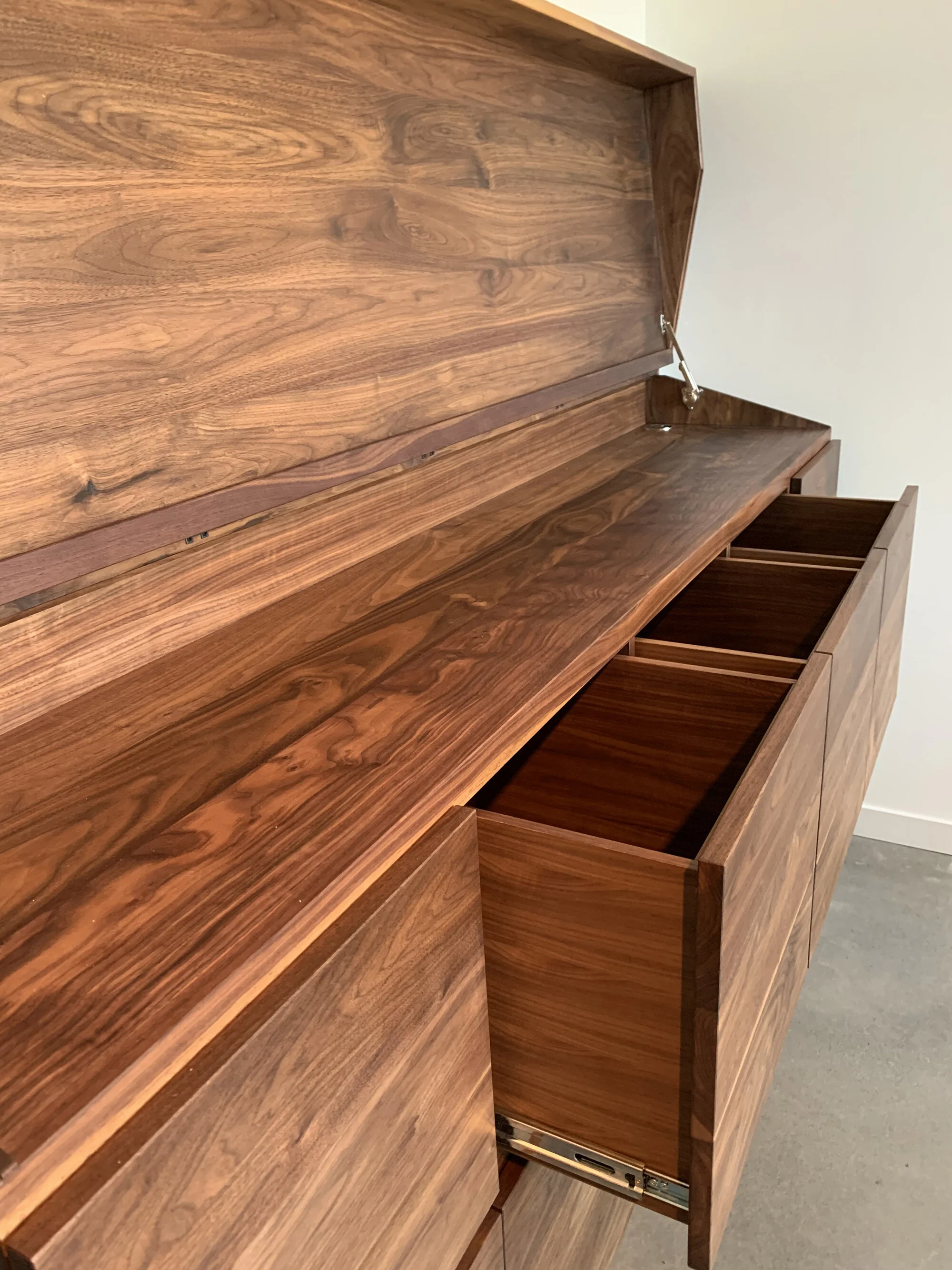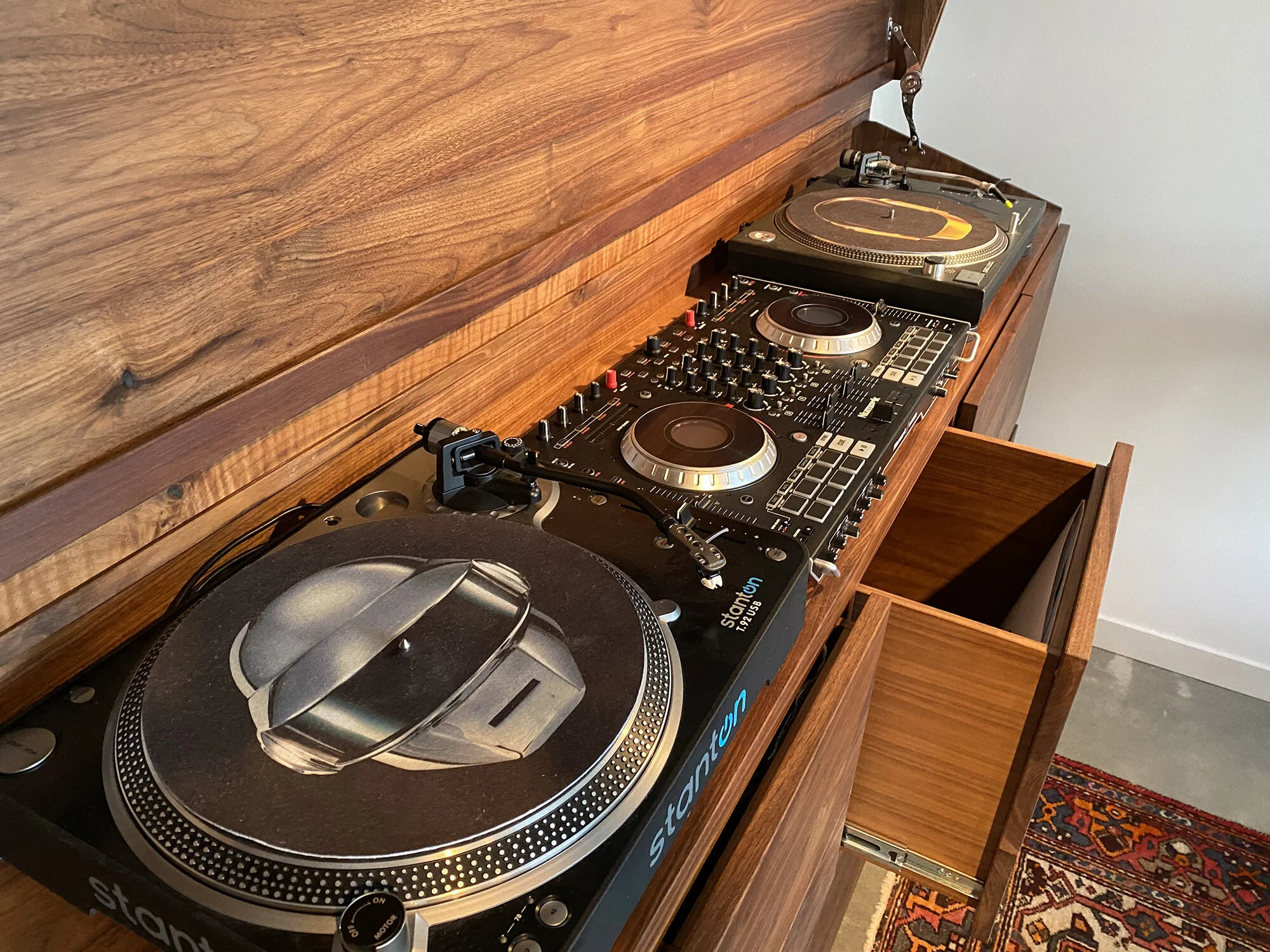 This custom DJ booth and bar cabinet was designed for a client with a passion for music.