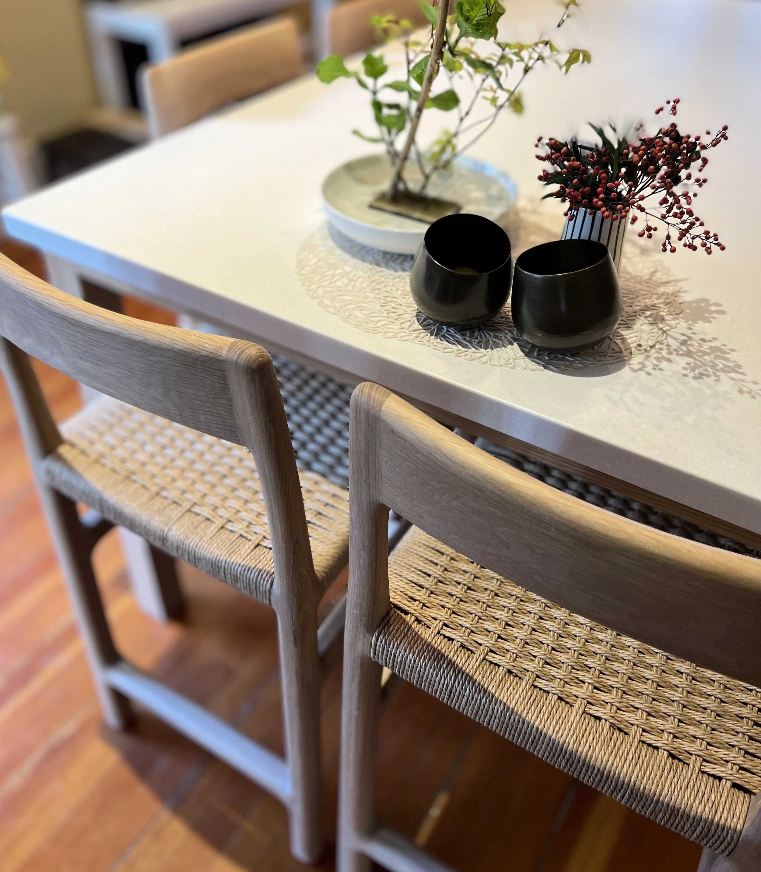 We designed and crafted custom counter chairs to complement the kitchen island, along with a movable kitchen cabinet that adds flexibility to the space. The cabinet can be repositioned to create additional seating when needed. The stools are made with Danish weaving cord, adding both comfort and a touch of craftsmanship to the design. Please see the video for a closer look at these functional and stylish pieces.