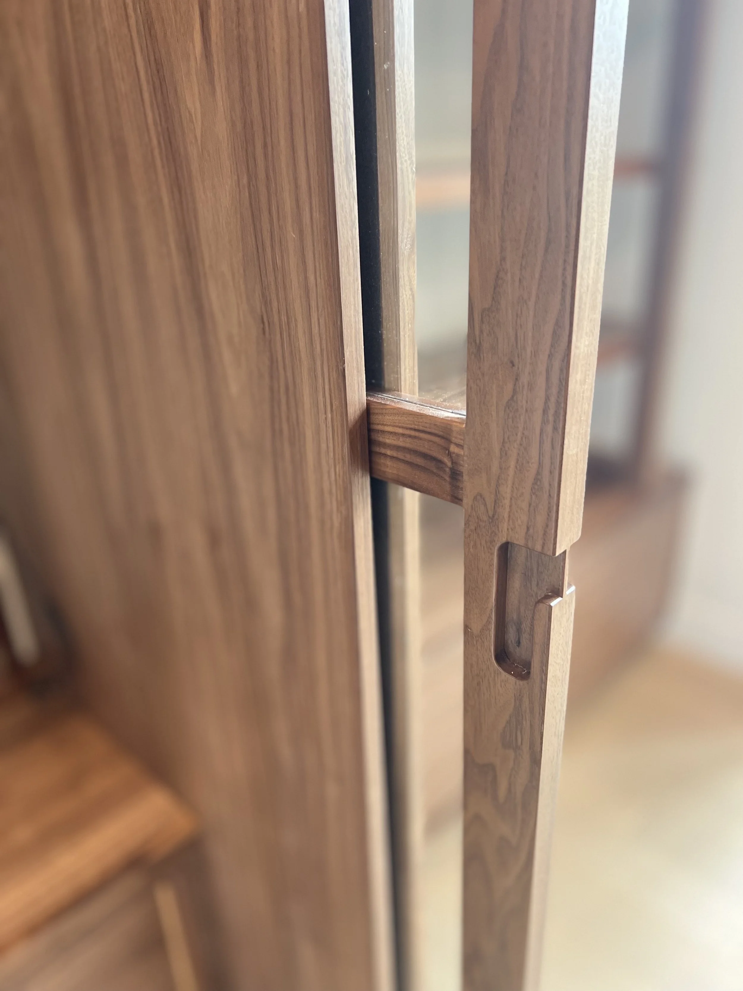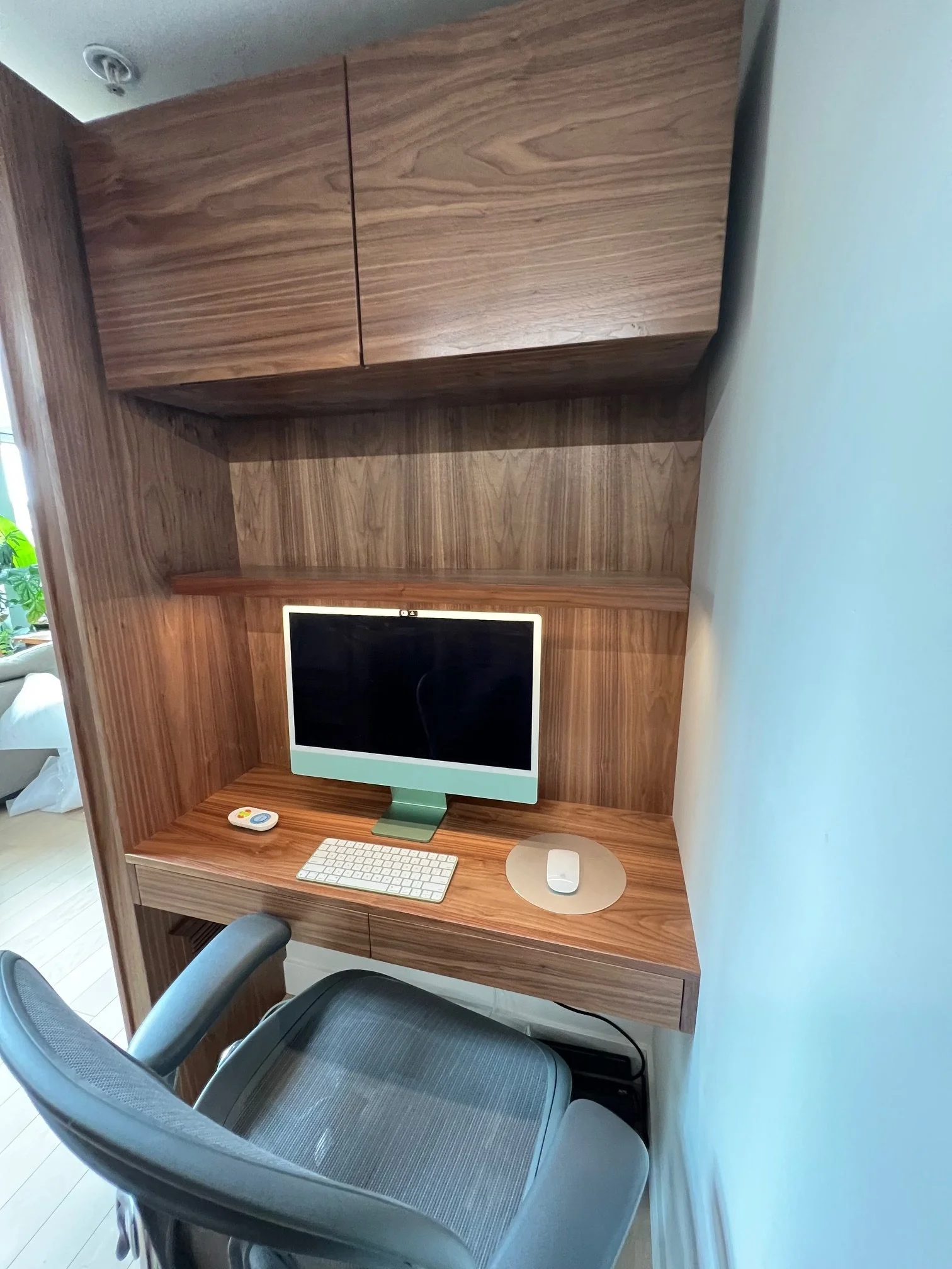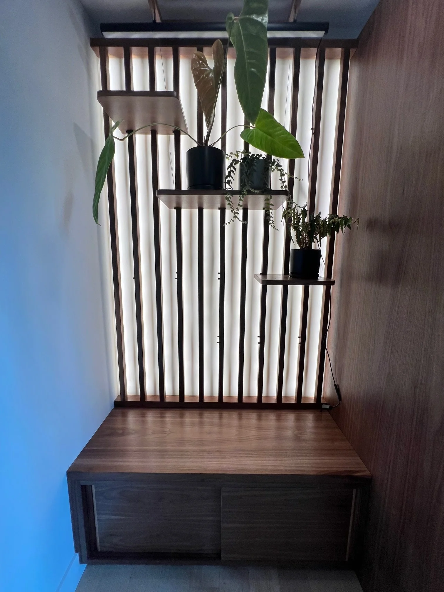 This collaborative project was designed for a client with a home-based business, combining functionality with Japanese-inspired aesthetics. We crafted a custom office space featuring shelving, cabinets, a glass sliding door with a walnut frame, and wooden strips with integrated LED lighting. A unique, custom-made fan and handle were added to the door, enhancing both style and practicality. Special grow lights were also installed to nurture his favorite plants, bringing a touch of nature into the workspace.