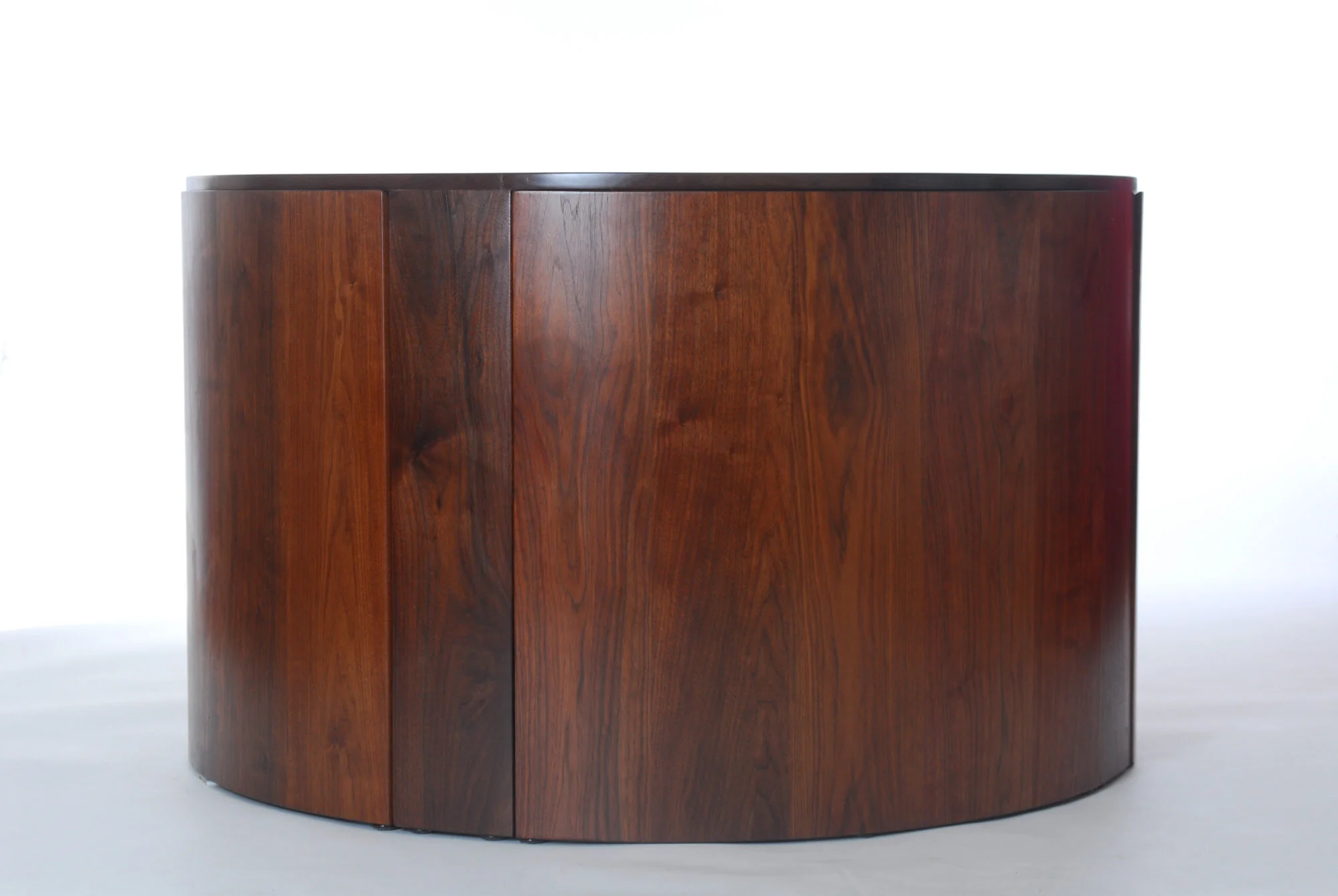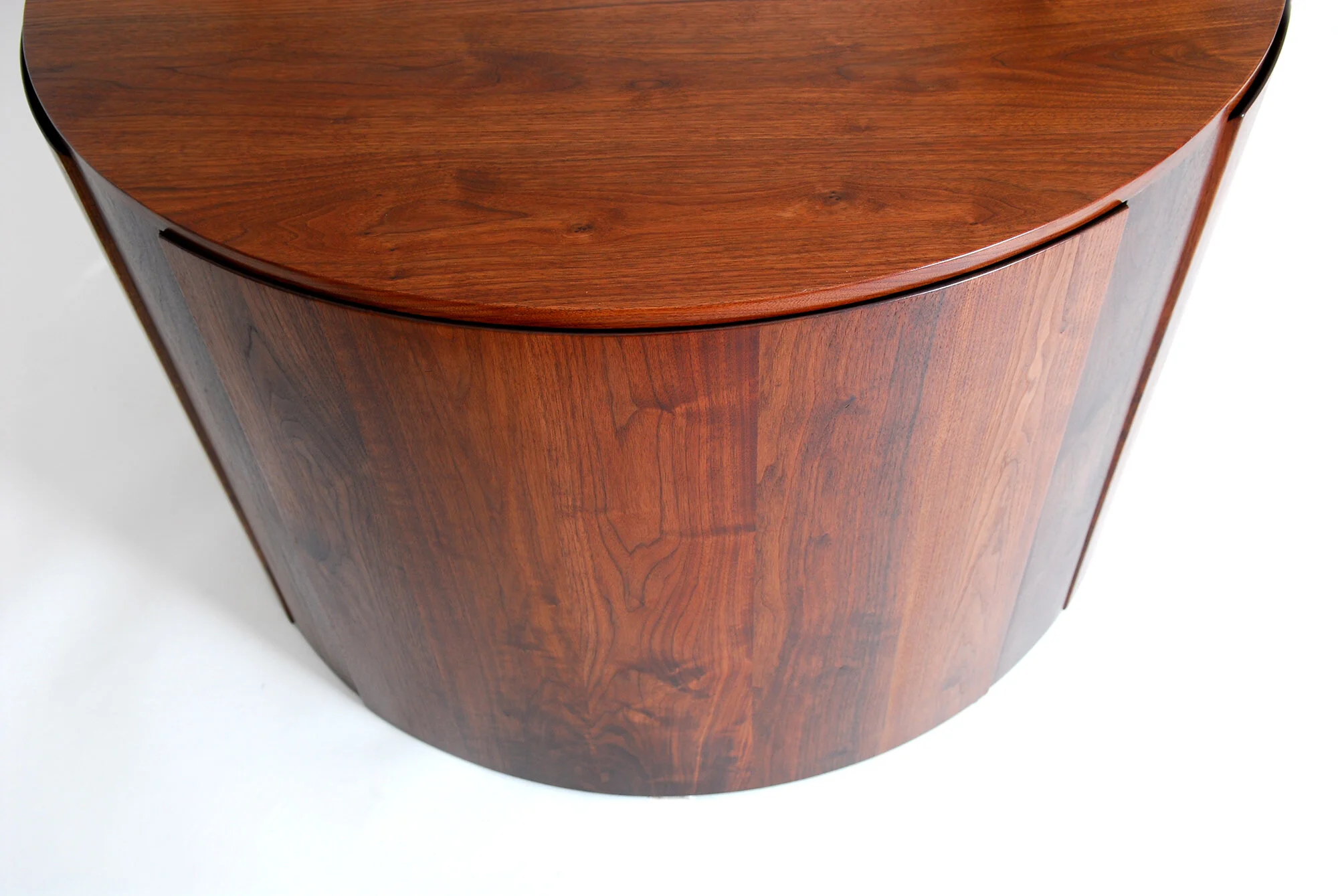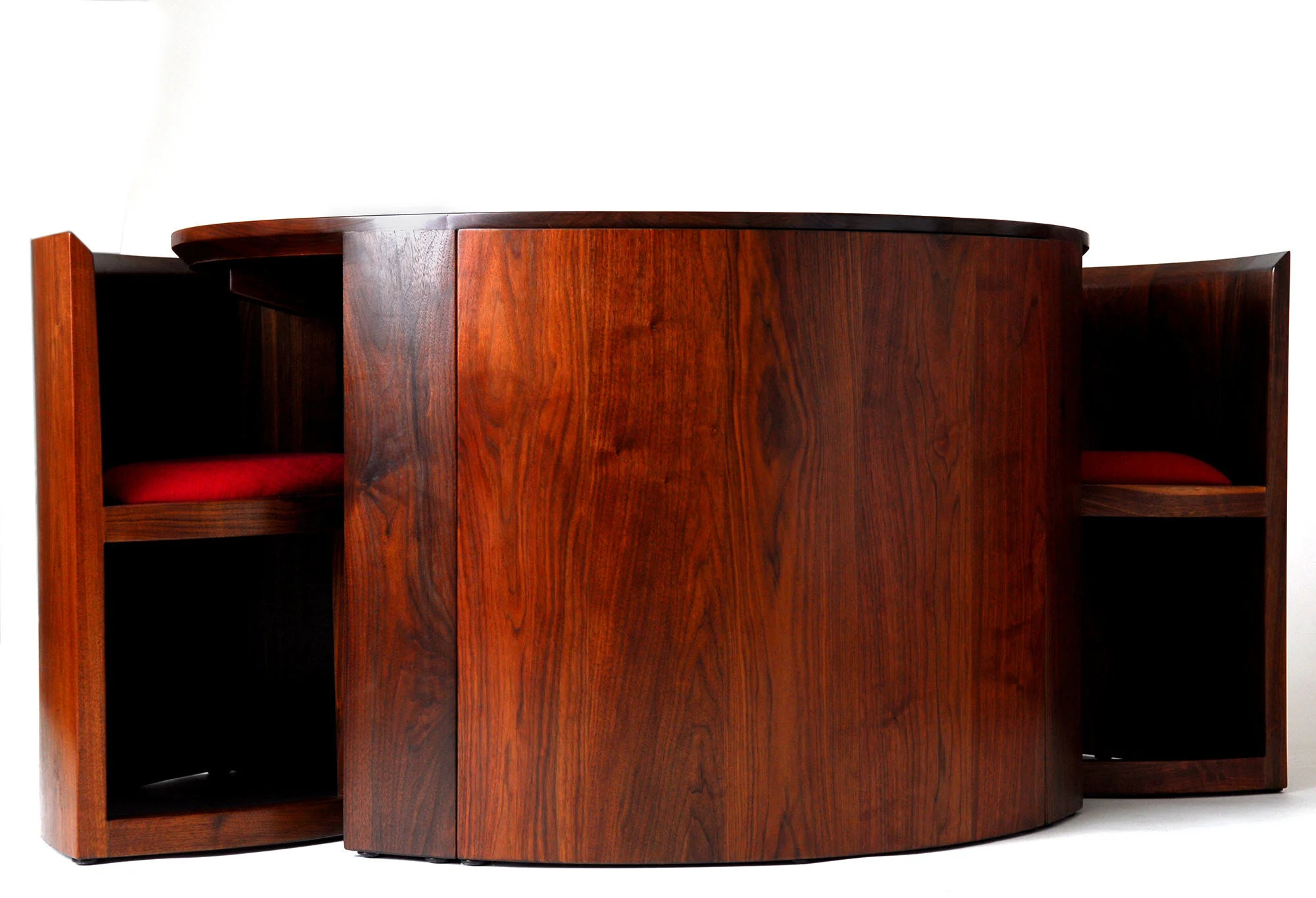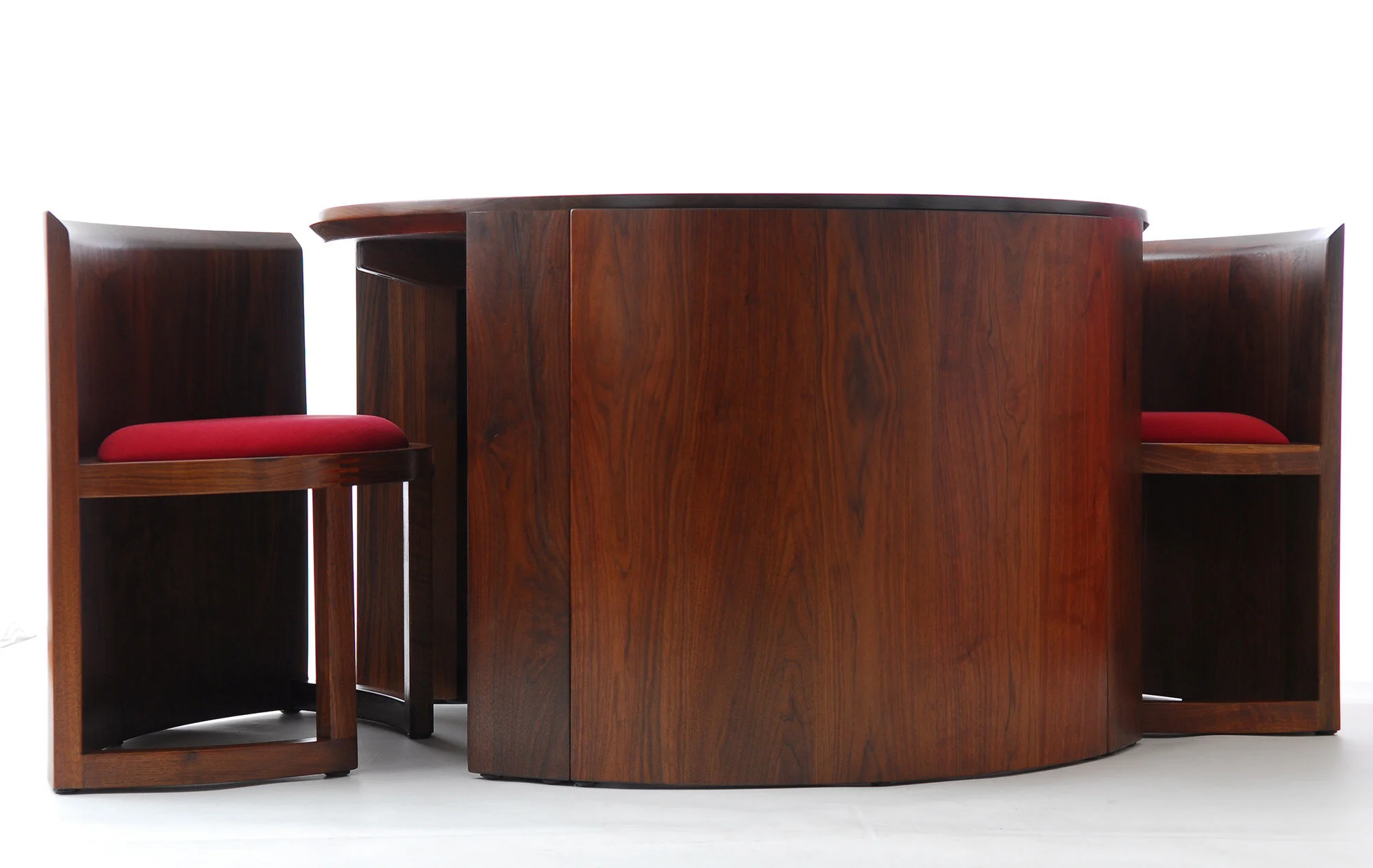 This dining table set holds a special place in our hearts as one of our very first projects. Crafted entirely from solid walnut, the process of carving the back of each chair into an arc shape was both challenging and rewarding. The table and four chairs come together seamlessly, creating the appearance of a tree stump—a true testament to the natural beauty of the wood. We paid meticulous attention to the details, particularly where the table and chairs meet, ensuring a harmonious and refined design.