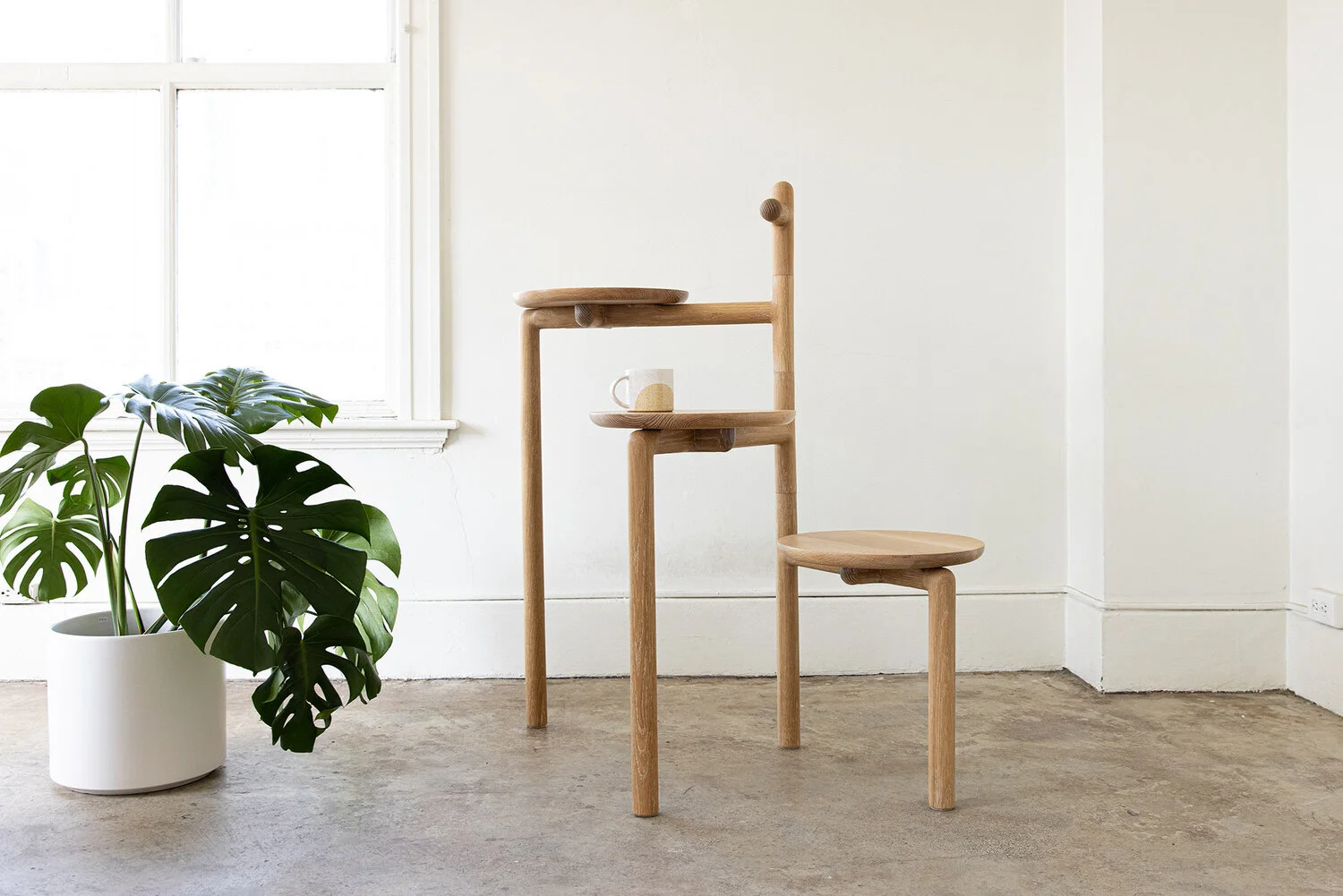 Concept: Created with love for a custom order in 2019, ENN is a remarkably multifunctional unit inspired by the simplicity of a clothes stand. This innovative and original design seamlessly transforms into shelving, a desk, seating, and more. Reflecting its Japanese name meaning "circle," each of the three tabletops and legs rotates a full 360 degrees and can be securely locked into position with a turn of the top wooden knob. ENN is also cleverly foldable for easy storage and shipping. Crafted from sustainable solid oak, ENN's fun and well-constructed design was recognized as a Longlist selection for the Dezeen Awards 2020.