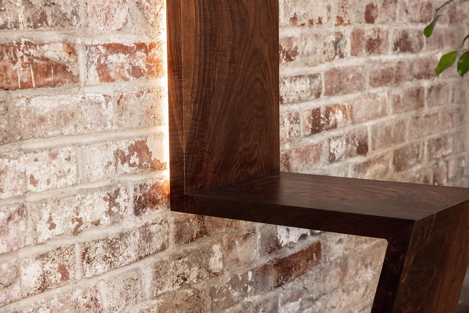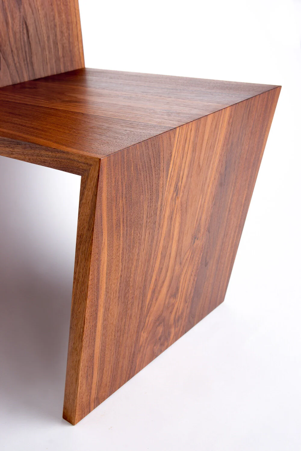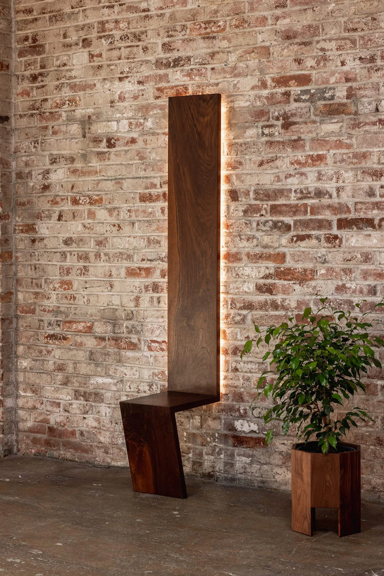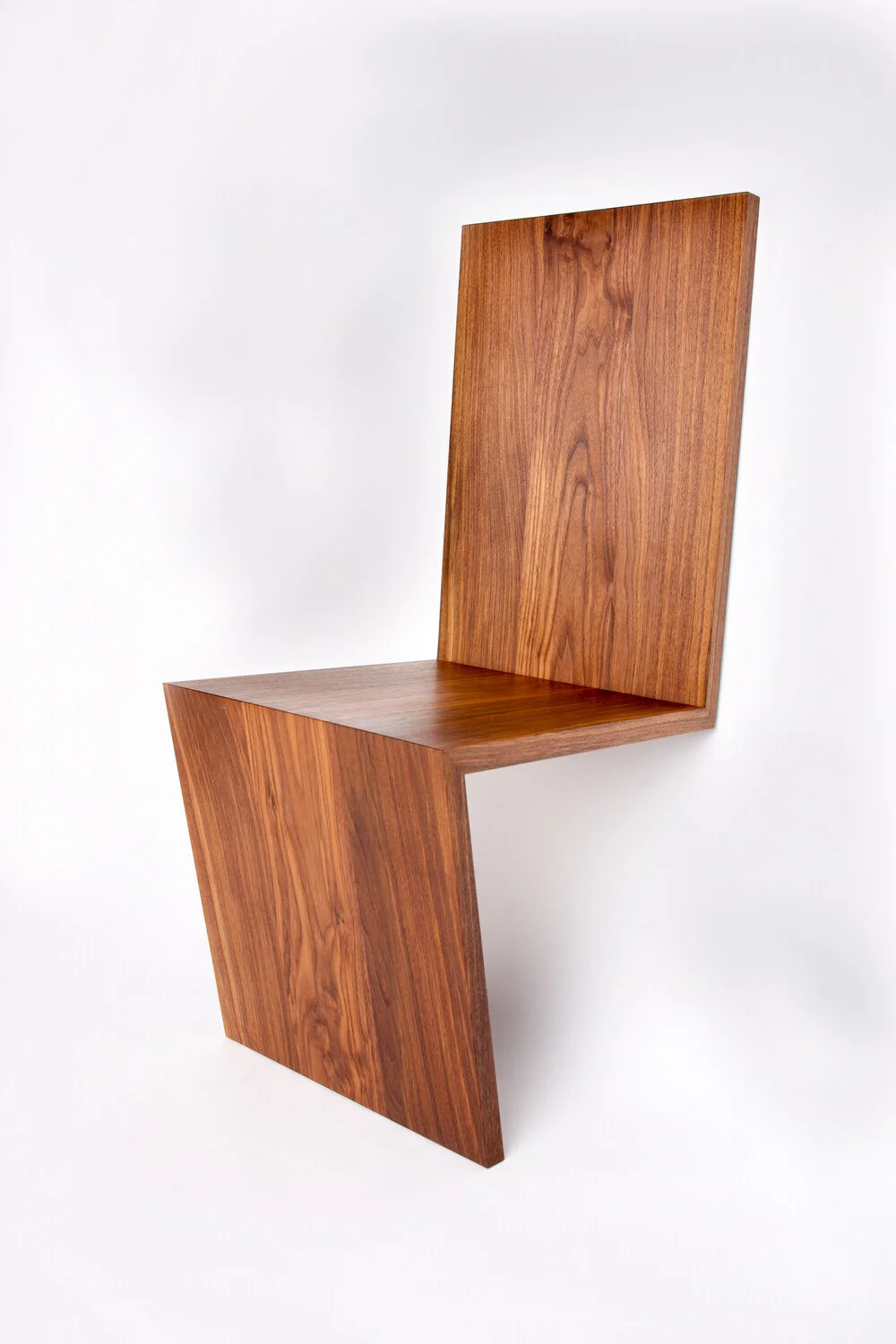 Concept: IVY is inspired by the image of ivy growing from the ground and climbing up a wall. When leaned against the wall, it transforms into a functional chair. Made from solid American walnut, this design is uniquely interactive, using the wall itself to complete the chair's form.