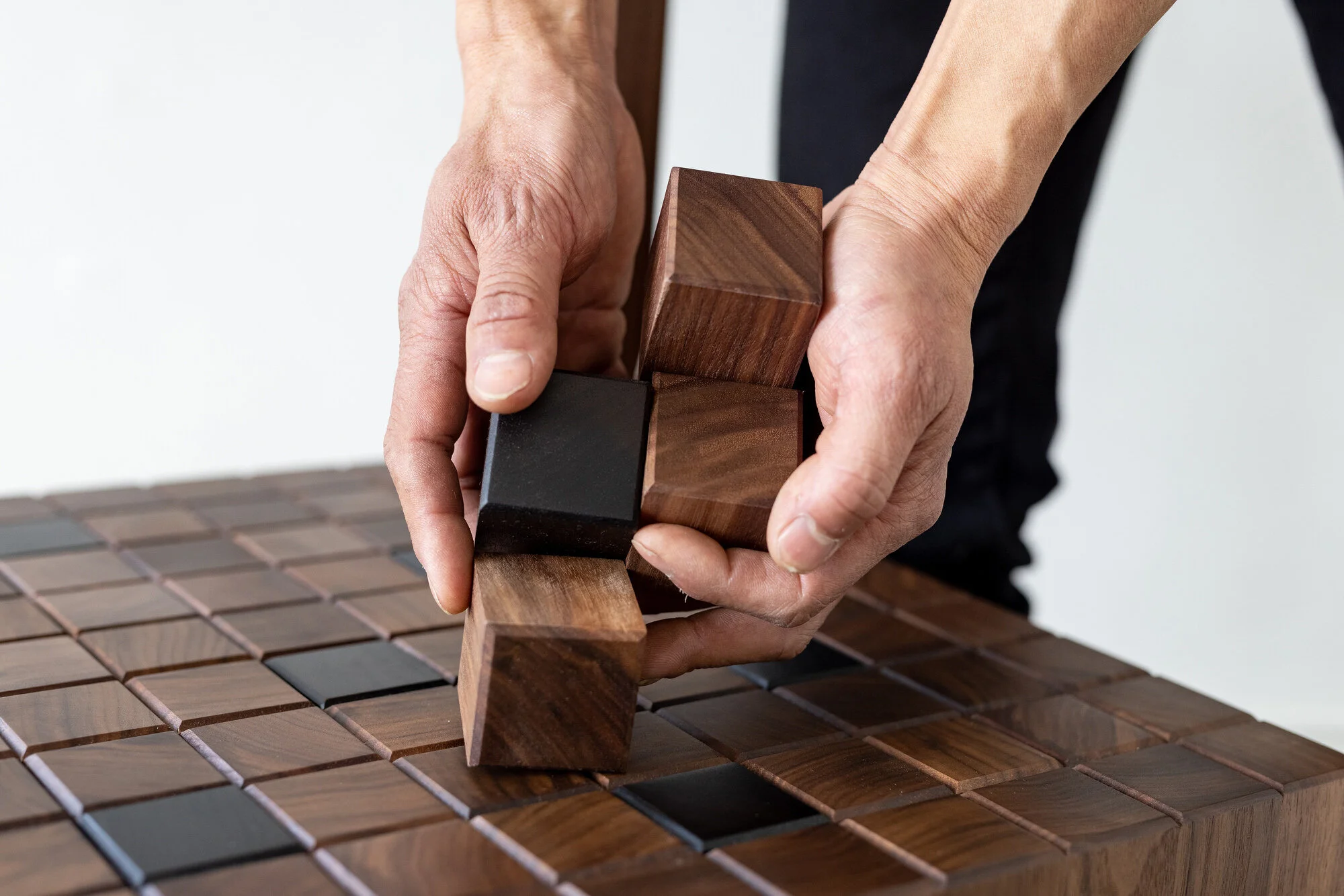 The name KIGI, meaning "many trees" in Japanese, reflects the essence of the design, with each hand-crafted walnut wood block symbolizing a tree in the forest. Sustainability is at the core of the design process, and KIGI is a one-of-a-kind piece, carefully handmade using leftover materials that would otherwise go to waste.