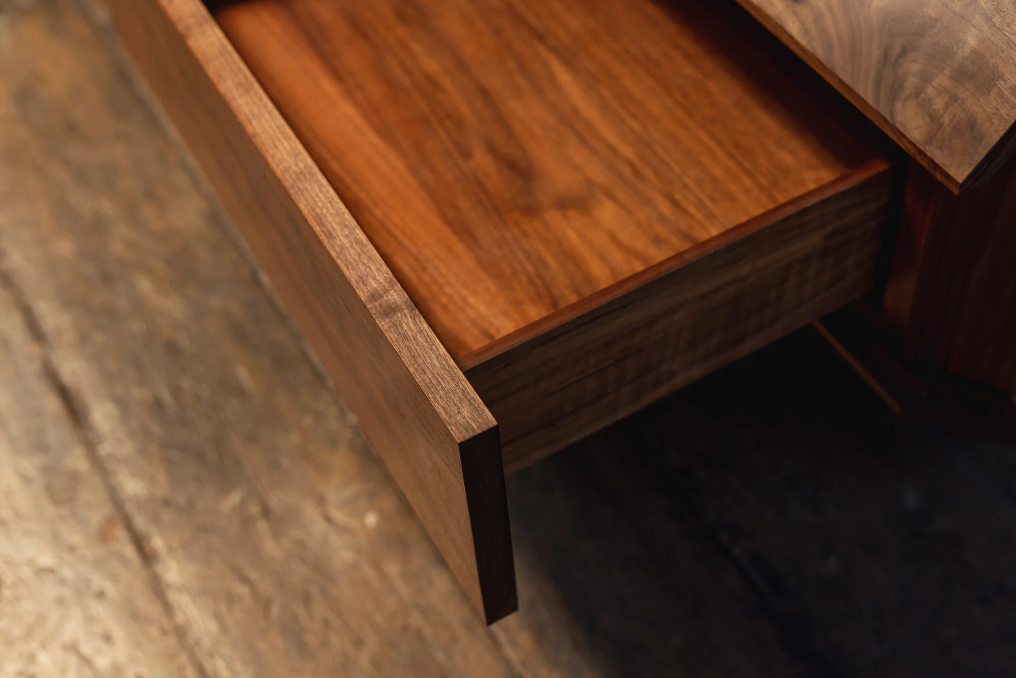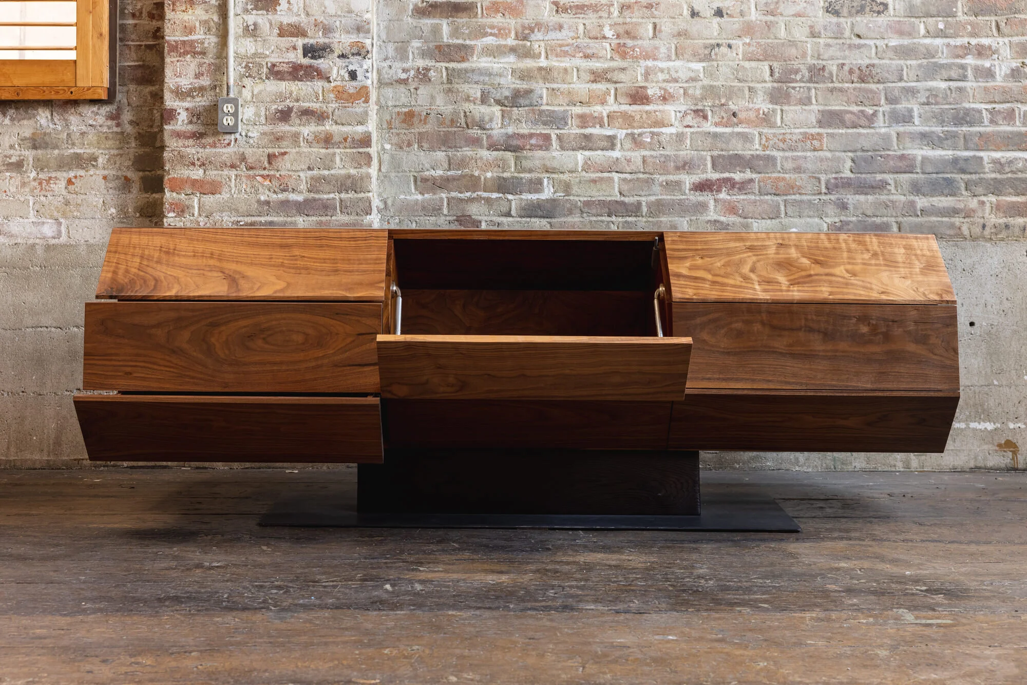Concept: The Octagon was first introduced at the "New Angles" exhibit at Kozai Style Gallery in Vancouver, Canada. Redesigned with a sleek new metal base, this unique sideboard features seven drawers and a push-and-drop-down door in the center. The Octagon reflects Seiji's passion for design and his meticulous craftsmanship, combining visual appeal with thoughtful functionality.